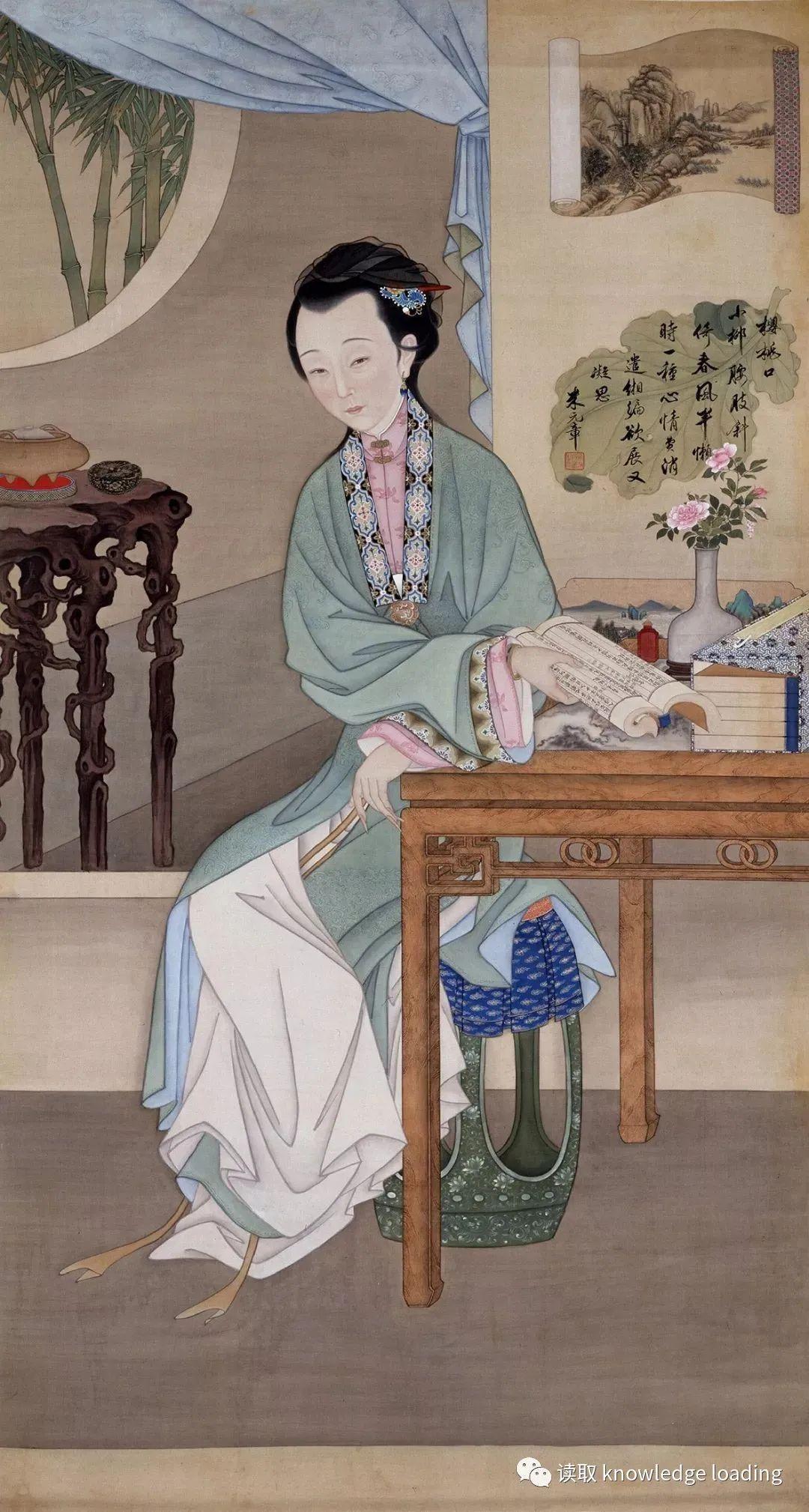 仕女坐在绿釉开光绣墩上,手中捧着诗集,但脸朝另一方向观看。书卷上是唐朝的一首七言古诗,杜秋娘写给情郎的《金缕衣》:“劝君莫惜金缕衣,劝君惜取少年时。花开堪折直须折,莫待无花空折枝。”在她斜依的黄花梨大理石面方桌上放置了一尊仿官窑的双陆尊,旁边是一红玻璃制鼻烟壶。身后墙壁上挂着一片蕉叶,其上有落款米元章的一首诗:樱桃口小柳腰肢,斜倚春风半懒时。一种心情费消遣,缃编欲展又凝思。身后天然木香几上摆放着双耳三足炉和黑漆描金双蝶纹圆盒。