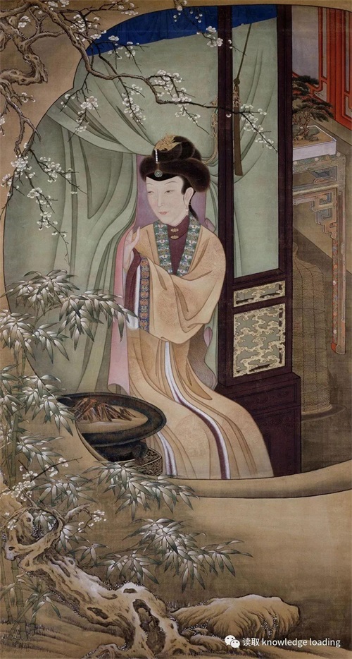 仕女临窗而坐,轻掀帐帷,观雪赏梅。户外翠竹披霜带雪,遇寒不凋,显现出顽强的生命力;白色腊梅尽情绽放。梅花不仅是著名的观赏花,拥有"五福花"的美称,被人们用以寓意幸福、长寿、吉祥。架子床上挂着一袭豆绿色的帐幔,帐幔外是一株盛开的梅花和假山上一丛青葱的竹子。炭盆将整个房间烘得暖暖的,颇有几分春意。