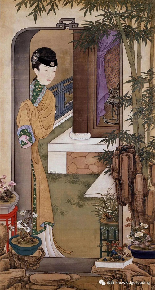 仕女倚门观望着满园春色,举止间似乎流露着淡淡的叹春情怀。整个画面被一堵墙分割成了两个部分,墙上开随墙门。门外累叠假山,山上放着几盆盆景。庭院中花草竹石满目。浅黄的月季以及朱红的梅花高低错落地放在假山石上,点缀出俏丽的景致。蕙兰的盆中还有一株小小的灵芝,代表着芝兰重茂。墙里则露出一间屋子的一角,屋子里放着两张黑漆描金的圆凳,墙上衬着规矩而低调的龟背锦,有可能是美人歇息的地方。