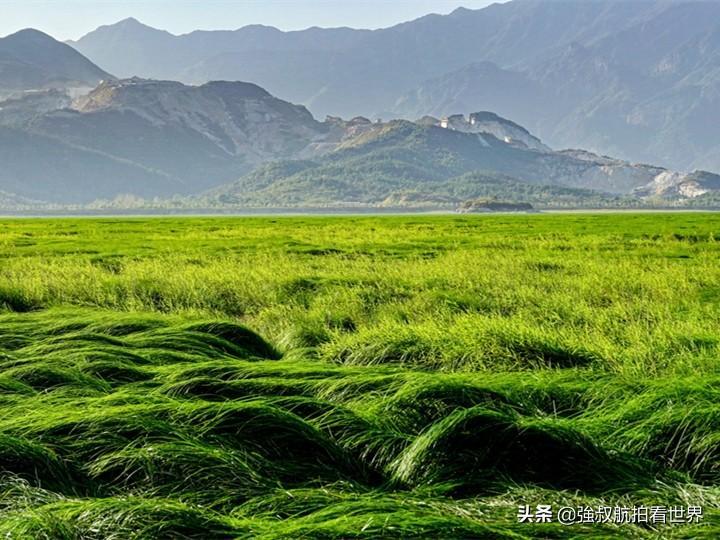 花季过后湖底也绿草茵茵,宛如连绵的大草原,有一条步行栈道蜿蜒在草原之上,一眼望不到尽头。
