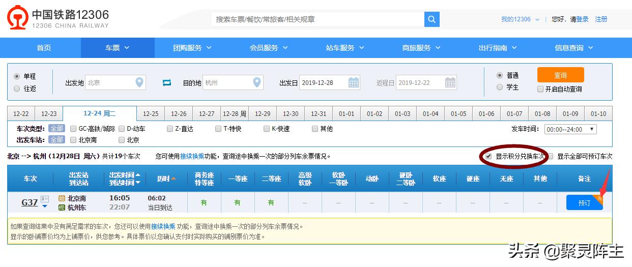 铁路畅行常旅客积分兑换火车票的操作与日常购票比较类似,这里以网页端为例,给大家看看。如下图所示,在查询完路线之后,我们能够看到一个“显示积分兑换车次的按钮”,选中之后筛选出来的就是可以兑换的车次啦!