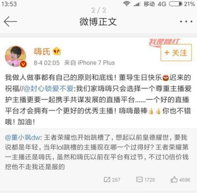8月17日,楚河发微博称“嗨氏侮辱主机游戏主播”成了新焦点;