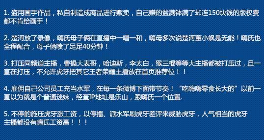 虎牙的人气榜之争。虎牙每段时间都会放出人气榜,嗨氏人气排行挺高的。于是就嘲讽主机游戏主播没有人气,自己的小小一部分一百万粉丝就能秒杀楚河为首的主机游戏主播。
