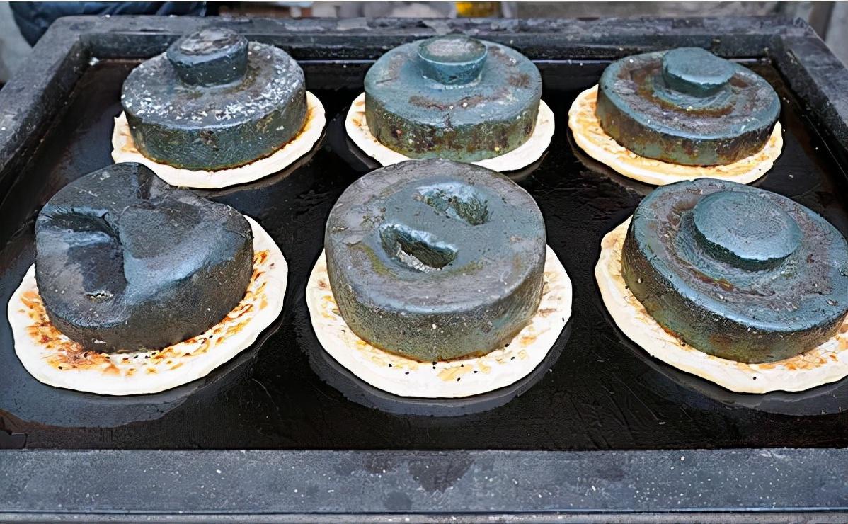 石头馃是徽州歙县街头的一道风味小吃,在每一个扁平的面馃上边都压着一个油光黑亮的石头,通过石头的传热使得面馃熟透,炕熟的面馃散发出异香,咬开之后,馅料滋润鲜美。