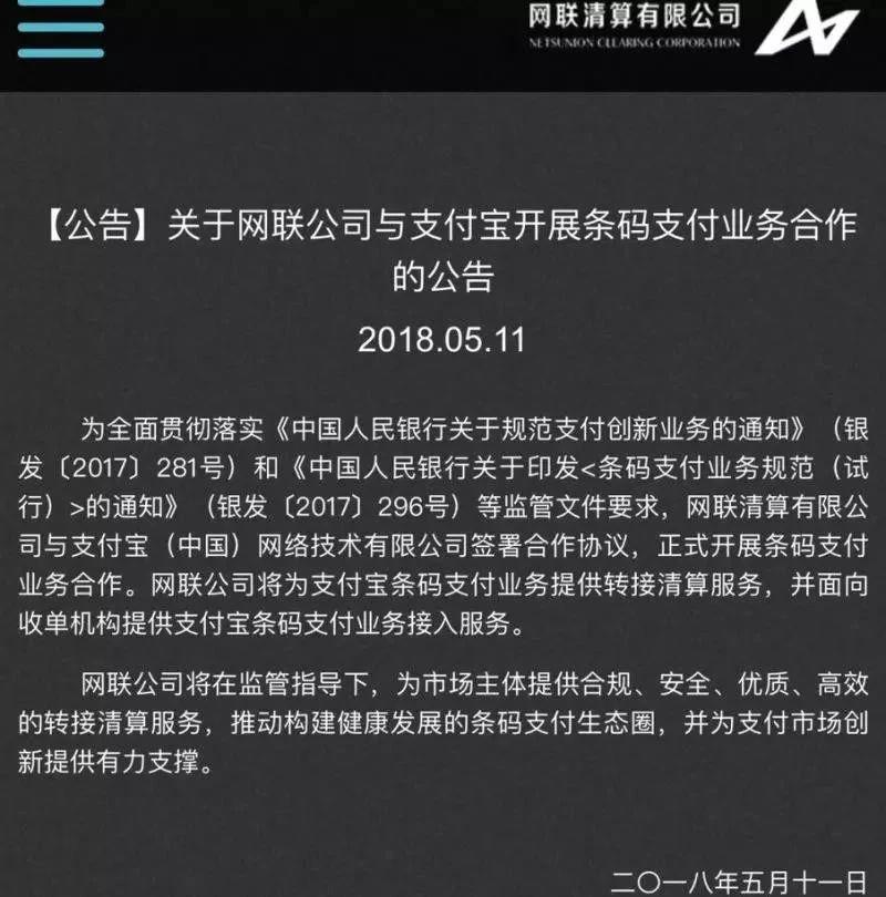 近日,中国网联和支付宝同时发出公告宣布双方正式签署合作协议,完成对接,开展条码支付业务合作,网联将面向收单机构提供接入和跨行资金清算等服务,支付宝正式被央行“收编”。