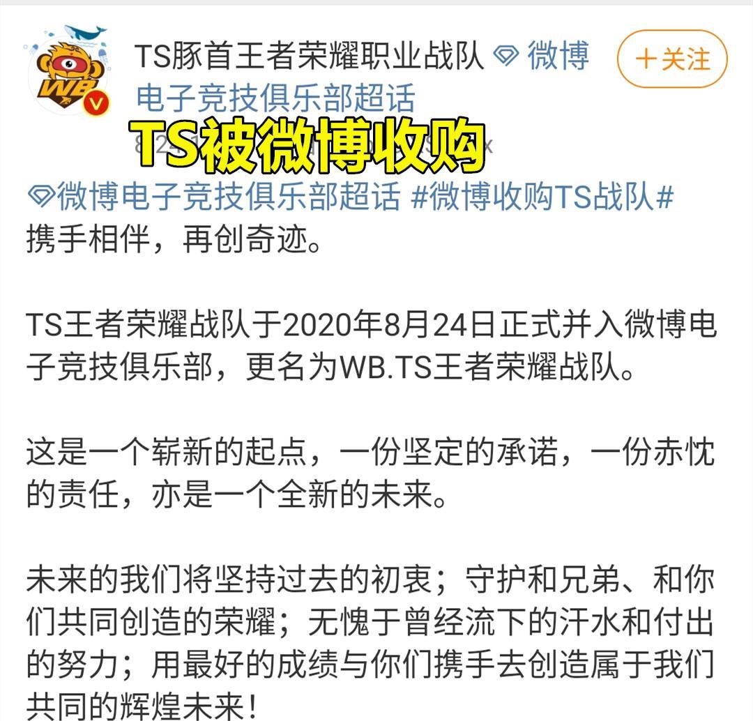 8月24日是王者荣耀2020KPL秋季赛转会期挂牌期的截止日。然而TS却迟迟没有官宣挂牌名单。8月24日下午4点左右,TS粉丝们期待已久的官宣终于来了!微博电竞宣布完成对TS的收购,而TS将正式更名为“WB.TS”,并且更换“新队标”!