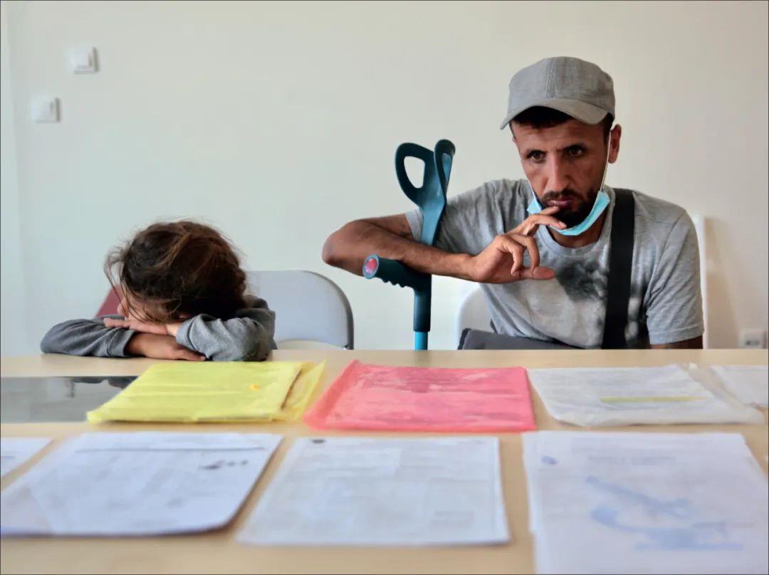 2021年9月,在希腊莱斯博斯的无国界医生健康中心,一名叙利亚难民和他的女儿坐在桌子前,面前是他所有的庇护文件和医疗记录。因叙利亚冲突中的战争和创伤伤害,他有复杂的医疗问题。庇护申请是一个长期而昂贵的过程。在失败和重新提交庇护申请期间,他们居无定所,陷入困境。儿童在难民营内接受教育的机会有限;家庭在获得急需的身体和精神健康服务方面面临更多挑战,往往不得不前往雅典。