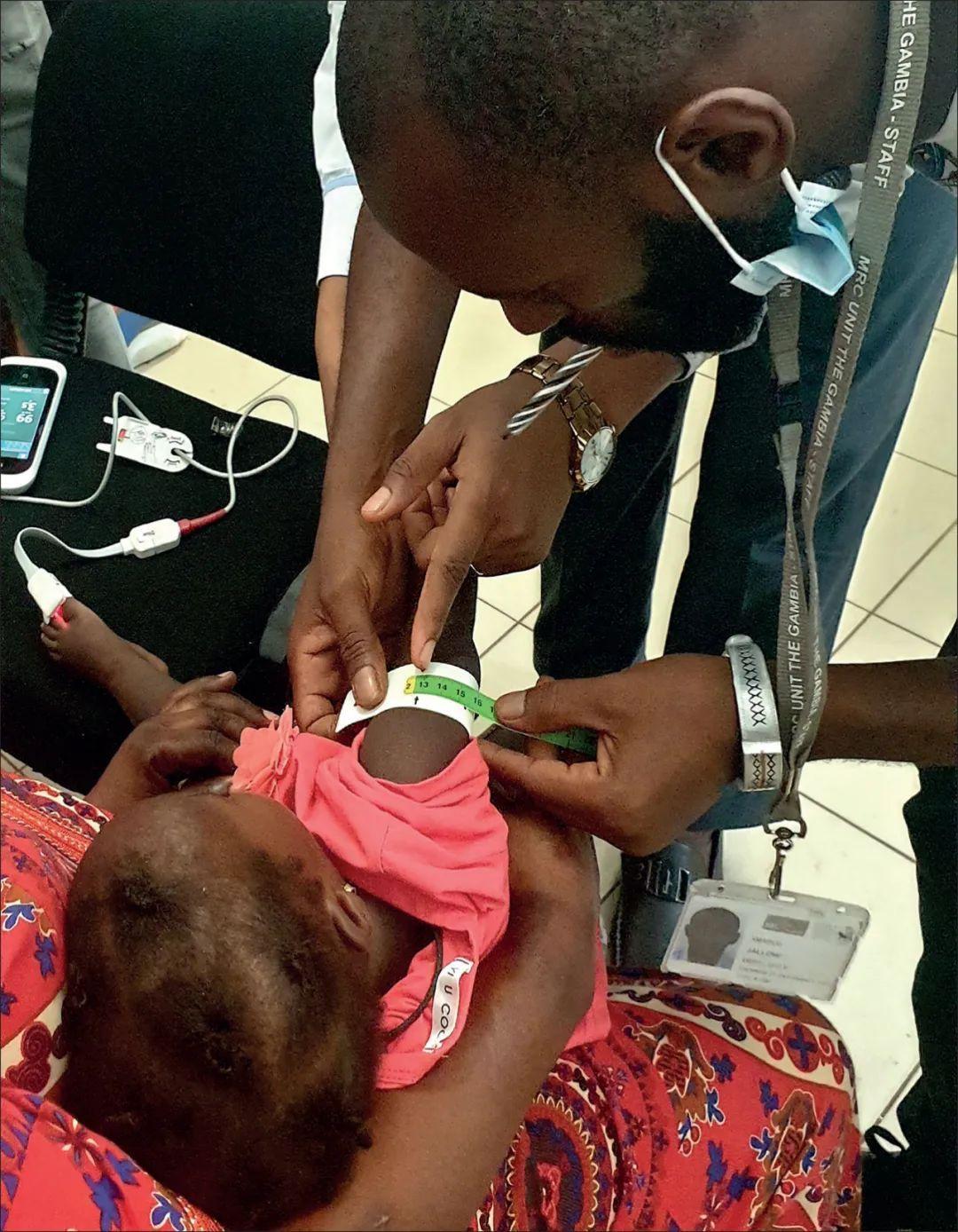 PRECISE-DYAD 研究通过追踪母亲和孩子,调查在健康怀孕或妊娠相关并发症(尤其是胎盘疾病)后健康轨迹的机制。研究在冈比亚和肯尼亚进行,儿童被追踪至 3 岁。在每次研究访问中,都会从母亲和孩子处收集一系列临床和非临床数据。图中位于法拉芬尼的冈比亚团队中的两个成员正在测量:中上臂周长,以帮助评估营养状况;以及血红蛋白浓度和氧饱和度。
