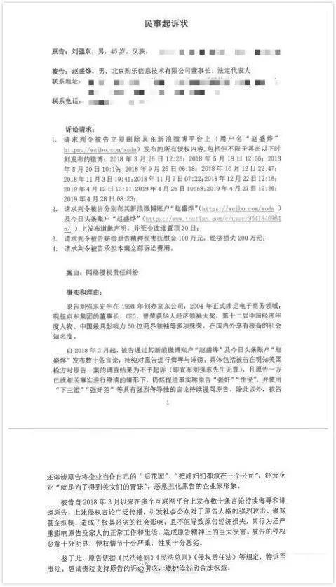 近日,赵盛烨在微博上公布了刘强东律师发给他的《民事起诉状》。