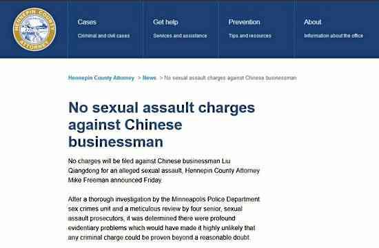 去年12月21日,明尼苏达州亨内平郡检察官弗里曼(Mike Freeman)宣布,经过当地警局彻底调查,以及4名专门处理性侵案件检察官的仔细审查,认定中国商人刘强东涉嫌性侵的案件,存在着严重的证据问题,检察官办公室决定不以性侵罪起诉刘强东。