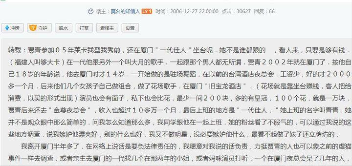 同年的12月27日,有位网友发帖爆料贾青在出道前,还在厦门某夜总会当过坐台女。