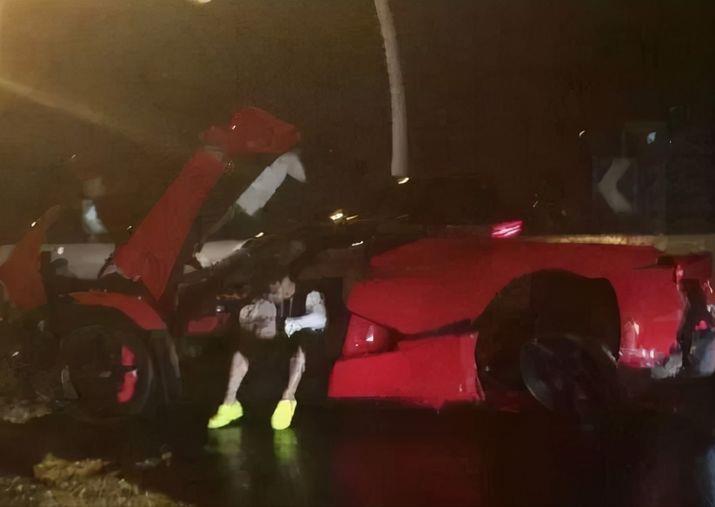 传言是富二代秦奋,开着自己价值三千万的拉风法拉利,要带贾青去吃饭,结果却因车技不行,豪车被撞成废铁。