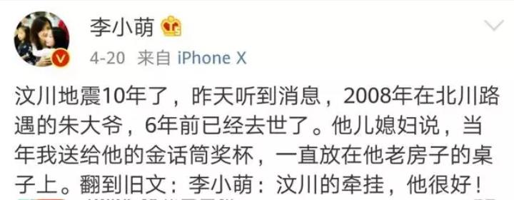 2018年纪念汶川地震10周年前夕,李小萌确认那位朴素的朱大爷已经在2012年去世了,他儿媳妇说,2010年李小萌送给朱大爷的金话筒奖杯,一直放在他老房子的桌子上。