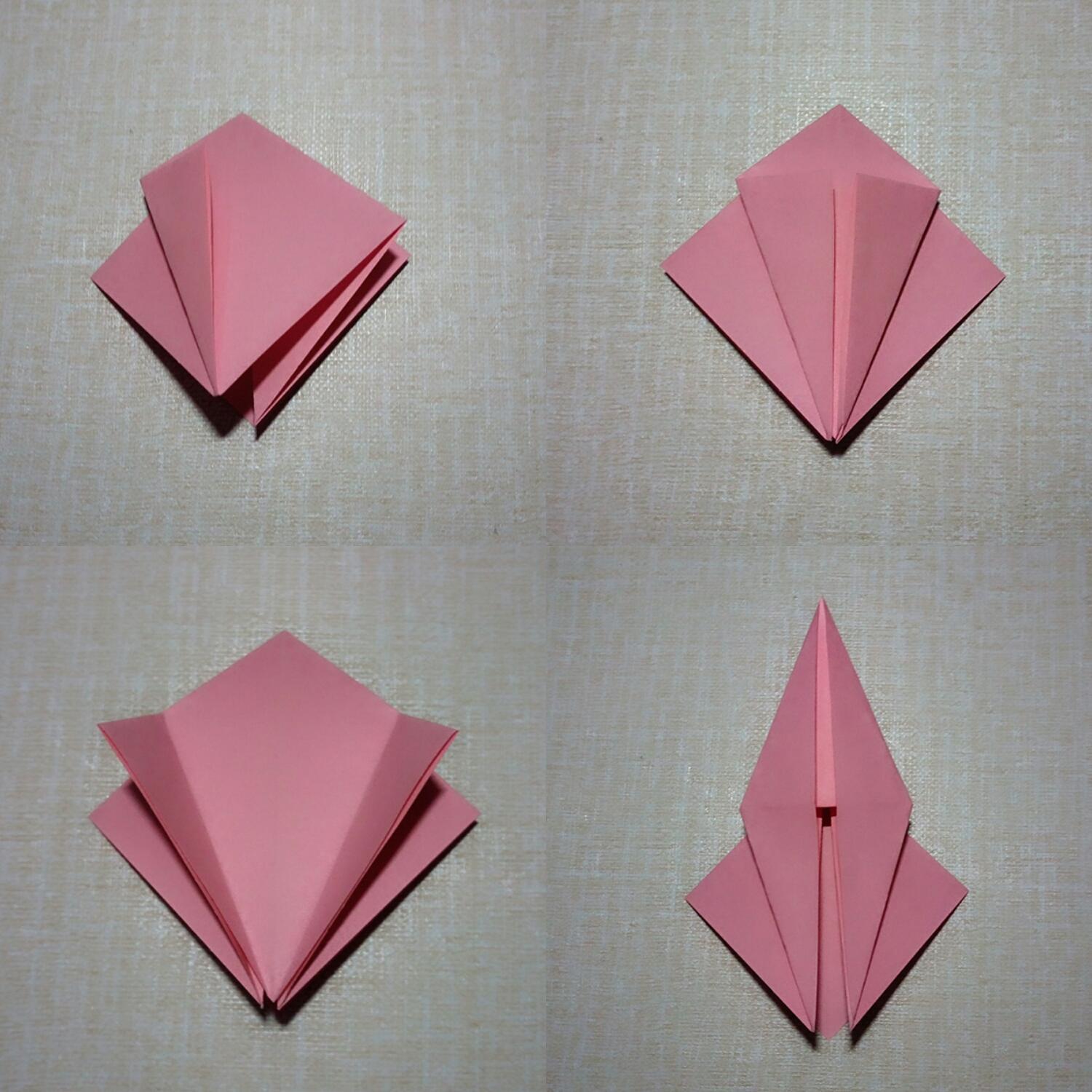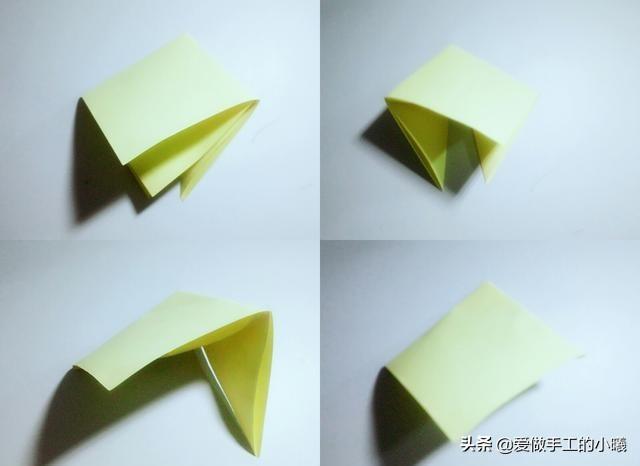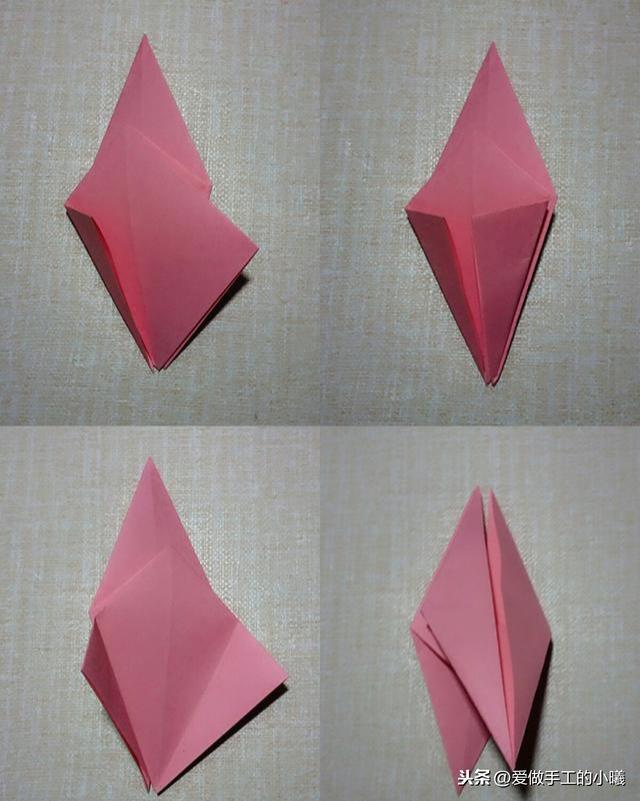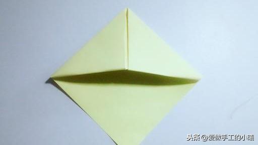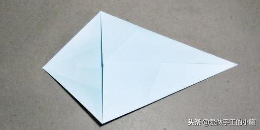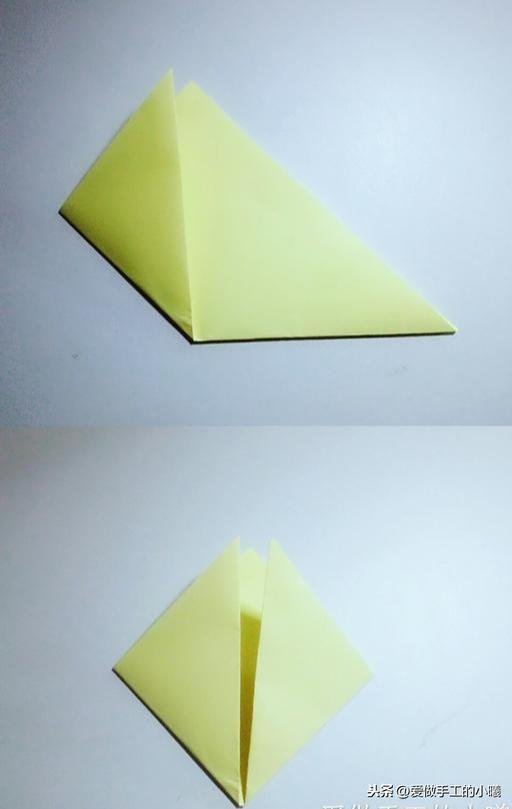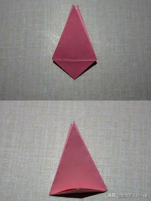 两边沿着中间对折(此时开口向下),打开,沿着折痕向里收,最后压平。