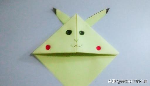 翻过来,画上皮卡丘的眼睛,鼻子,嘴巴,贴上耳朵,就完成啦!