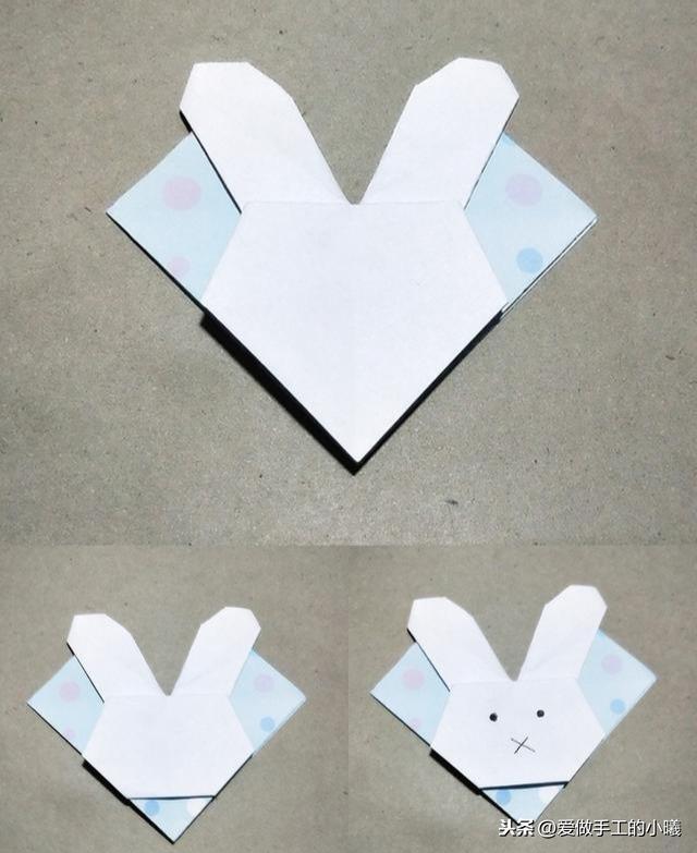 翻过来,底部的角向里折叠(仅白色部分),画上眼睛和嘴巴,可爱兔子书签就折好啦!