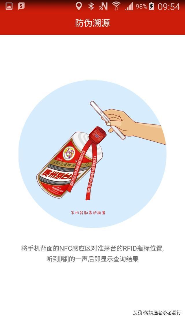 3.开始查询。进入“贵州茅台防伪溯源客户端”主界面后,将手机背部的RFID感应区对准茅台酒瓶盖顶部。