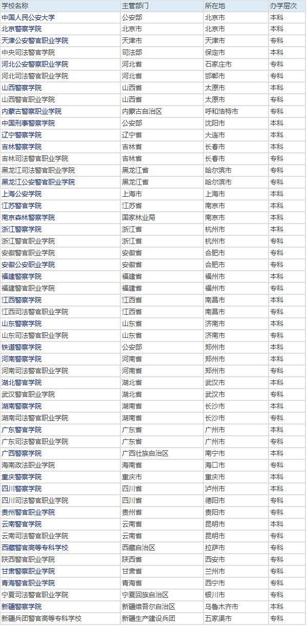 篮字为公安院校,黑字为司法警校