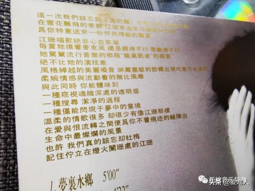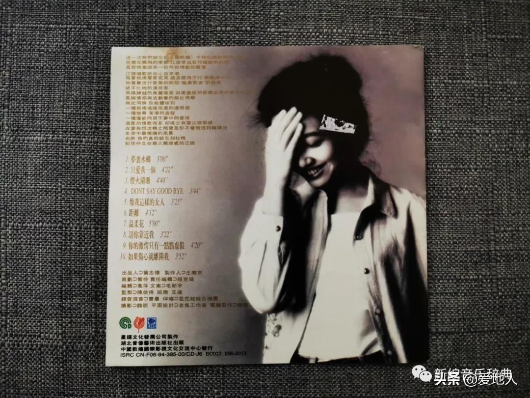 因为这个事儿,特意找出了江珊的这张《只爱我一个》专辑。虽然买了专辑好久,但其实对这张专辑的印象真不深,甚至在很多时候,提到江珊这唯一一张个人专辑时,还老会把这张专辑叫成《梦里水乡》……
