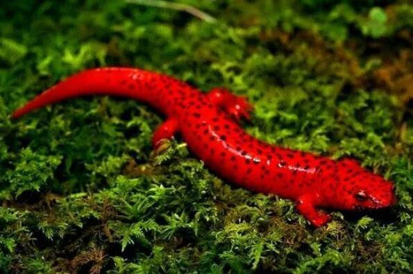 红蝾螈是一种无肺螈科动物,全身呈艳红色,并且布满黑色斑点,它们多栖息在山地或平地,喜欢在夜间捕食。