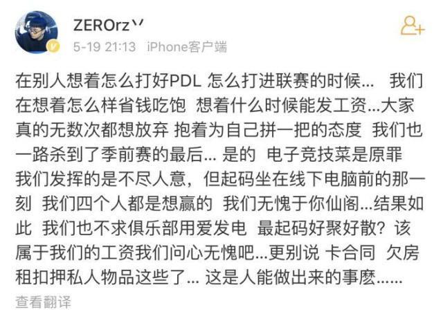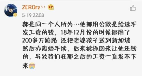 后来,Zero还指出,他们老板曾在去年12月的时候挪用了200万跑路,被抓回来还钱。也就是那时候开始,选手的工资开始出了问题。算上这次跑路,仙阁的老板一共卷走250万。