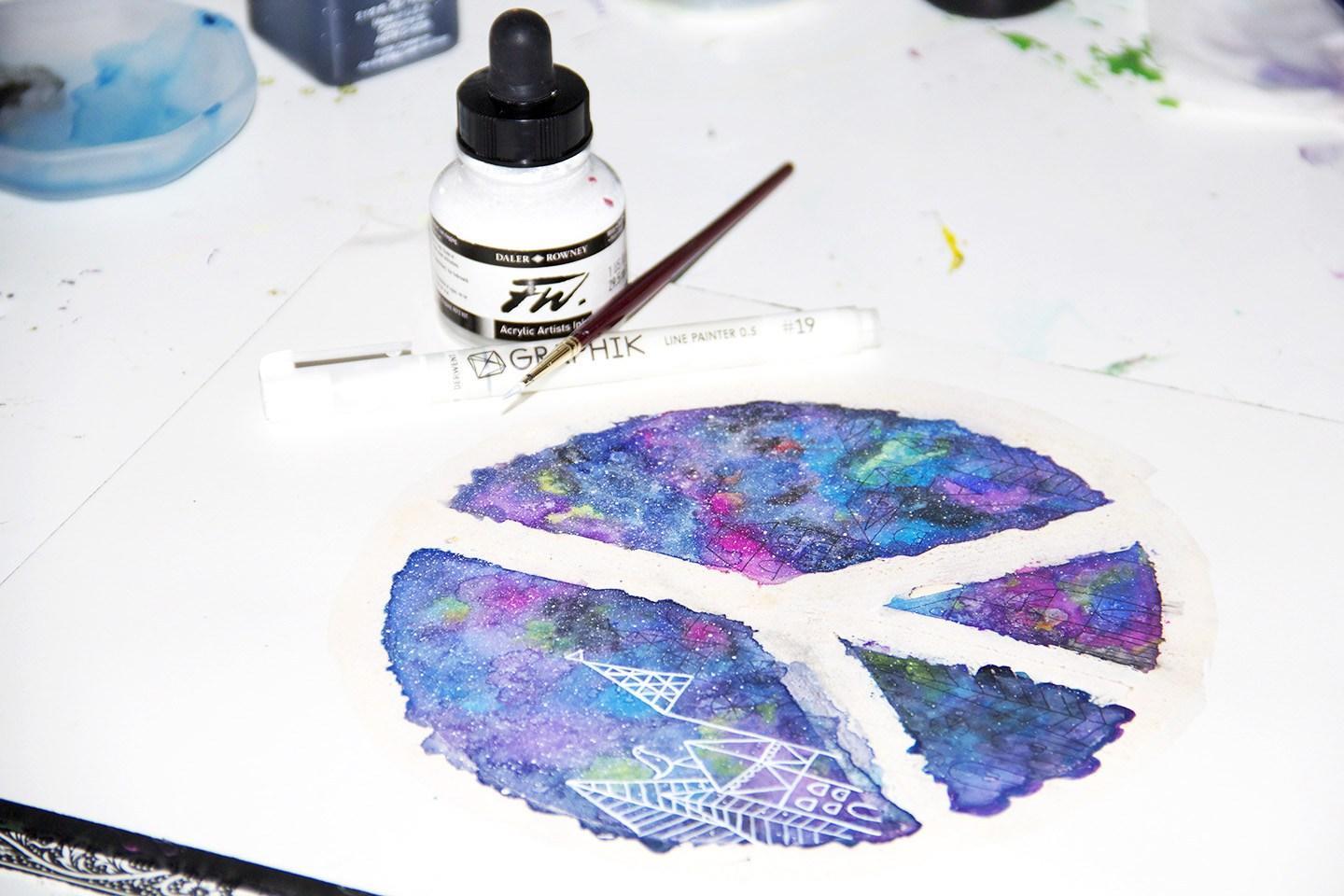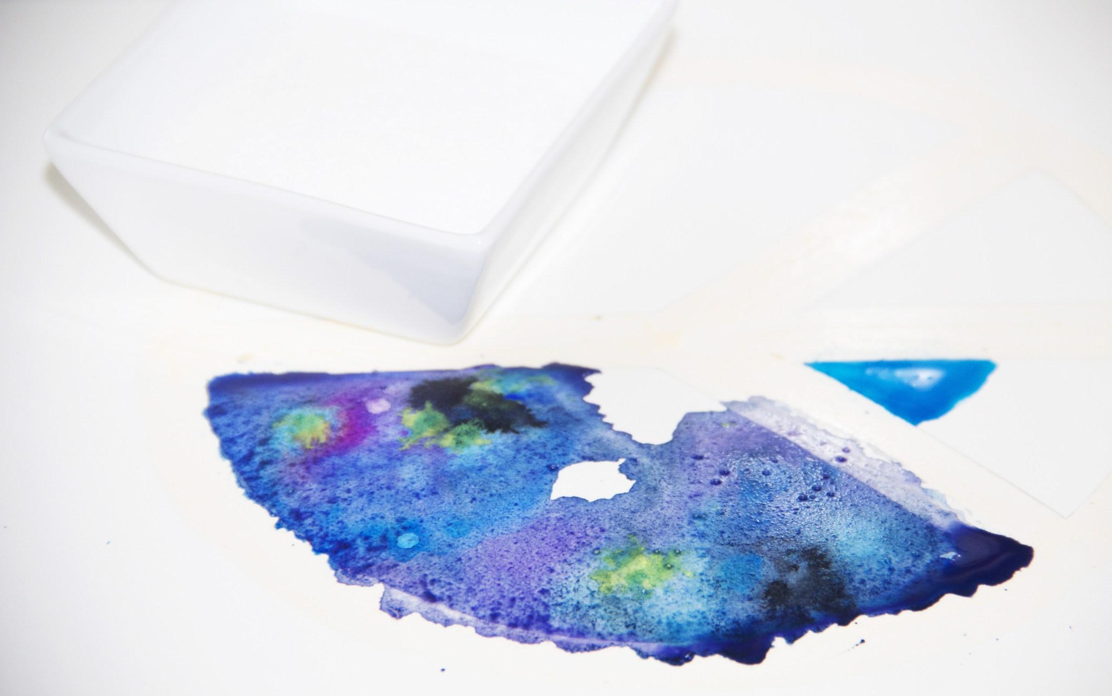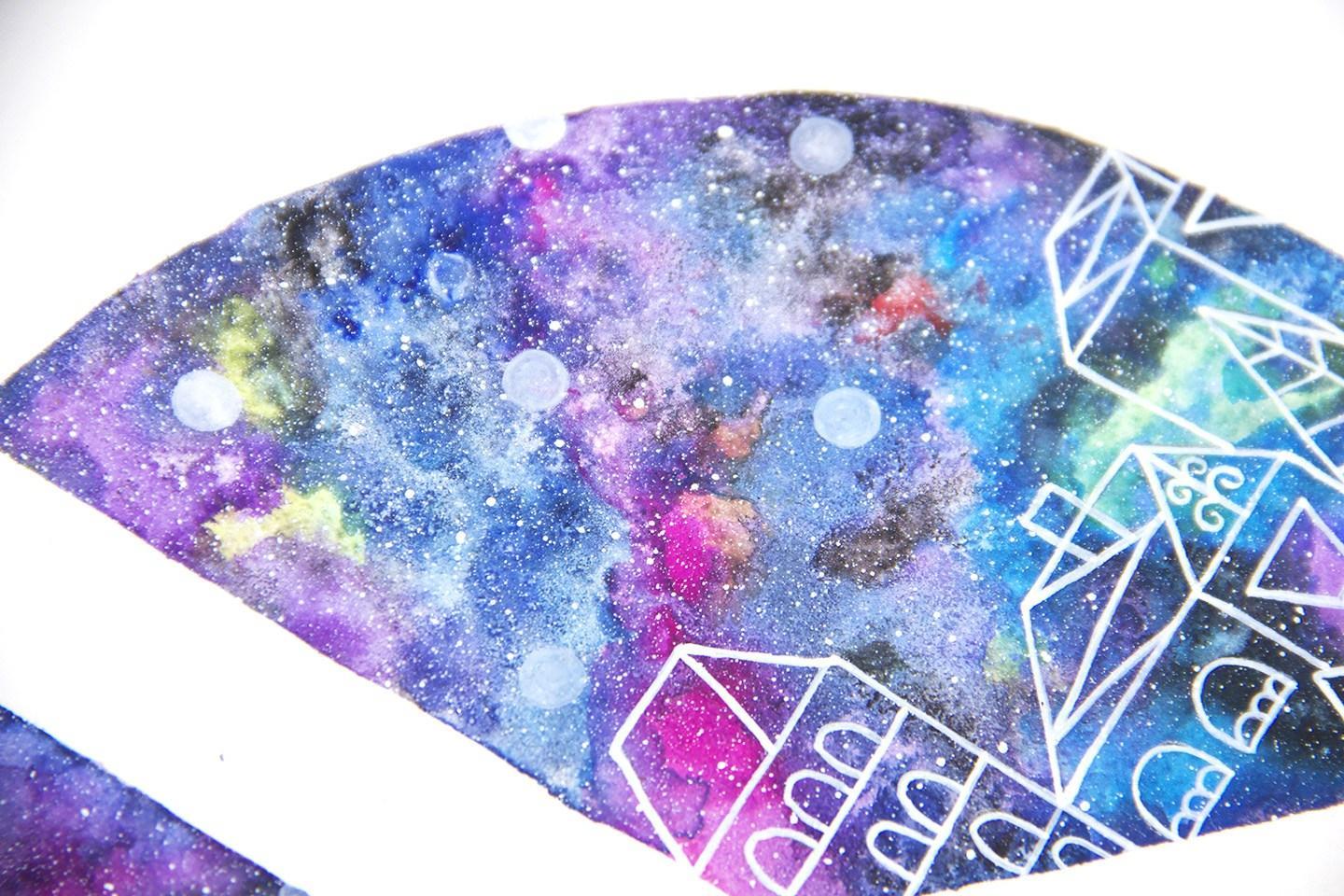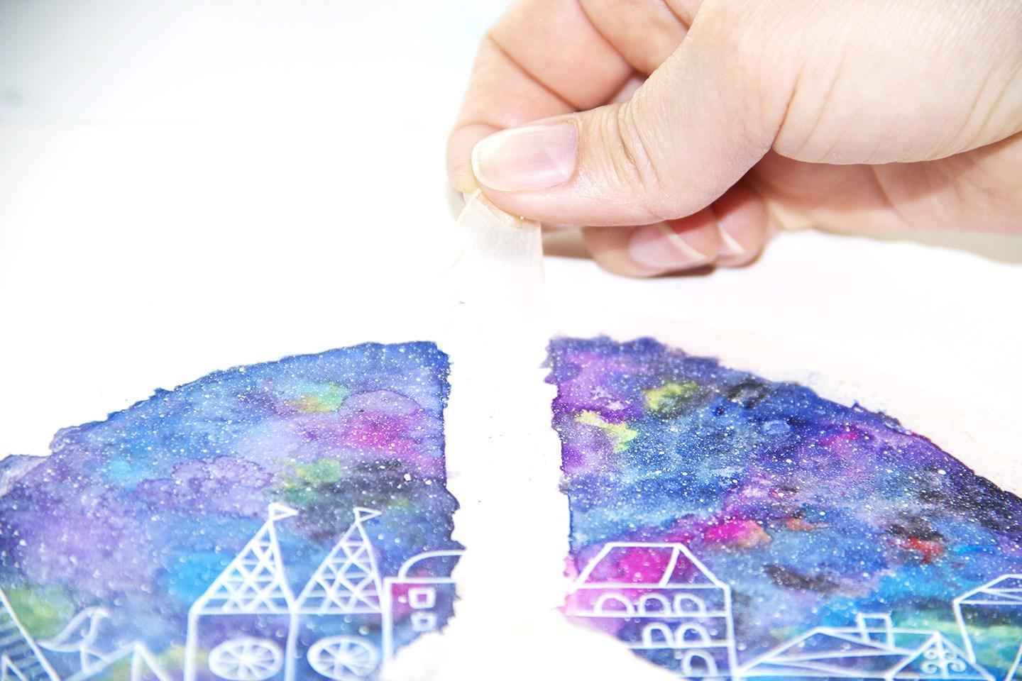 第六步:在绘制星空的效果时,你也可以使用沾上酒精的棉签添加不同的质地。使用沾满酒精的棉签轻柔涂抹绘制区域,然后你就可以坐等魔法生效了!