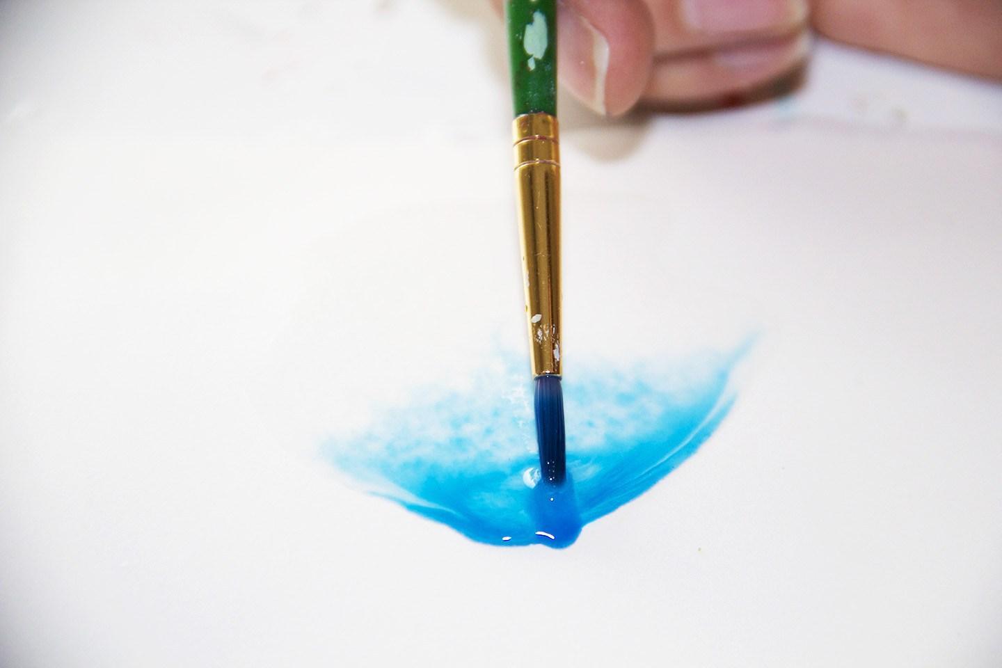 请不要用非常重的笔触去画,要让手部动作流畅和自由,使色彩随着水在纸上自然流动。
