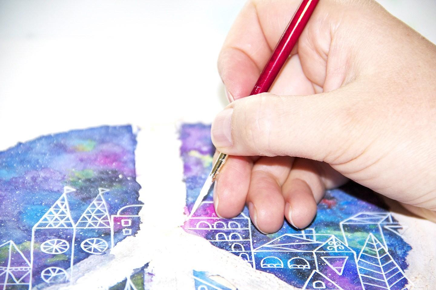第九步:在干燥的区域内绘制出你想要绘制的图案。在这里我画出了城市。(如上图所示)