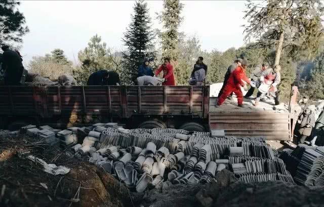僧俗二众一起卸载三圣殿屋顶所需青瓦