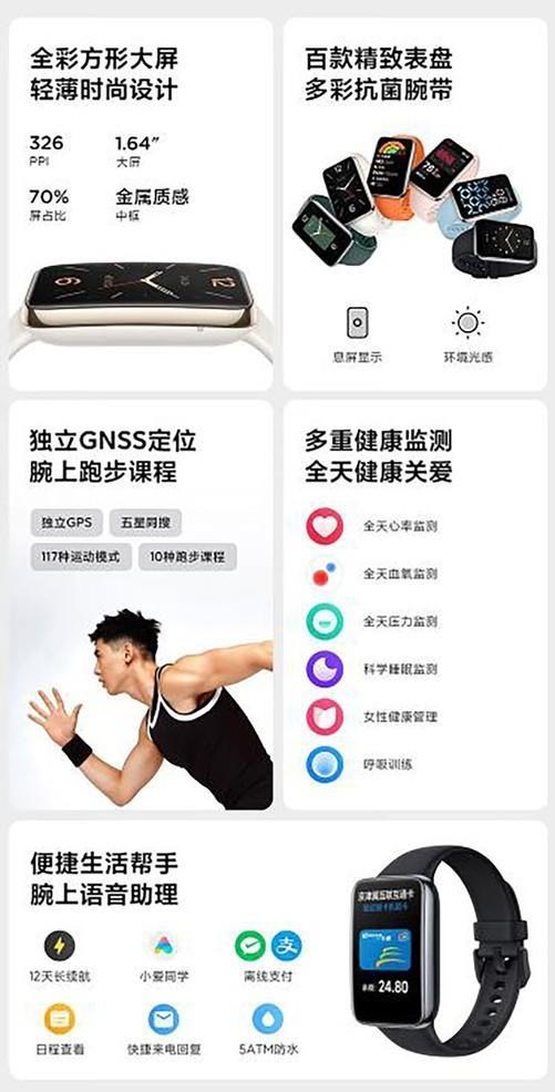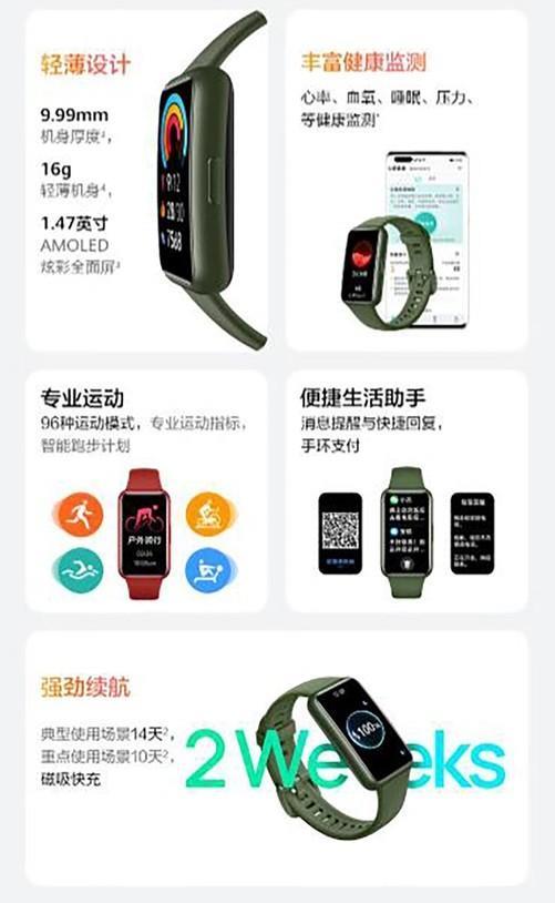 荣耀手环6同样采用了1.47英寸大彩屏和2.5D弧面玻璃,让触控体验更流畅,并且按键放到侧边、改用实体按键在一定程度上方便使用。该款手环在健康方面搭载了HUAWEI TruSeenTM 4.0全天候精准心率监测,优化硬件光路和算法,可以精准检测血氧饱和度。改用磁吸式充电,增加快充,也让使用感更好。并且,荣耀首次在手环上应用了快充技术,充电5分钟就能满足2天的典型场景使用。