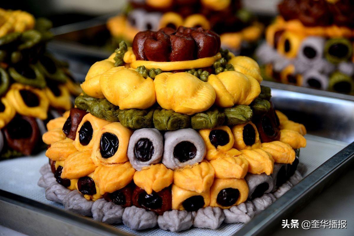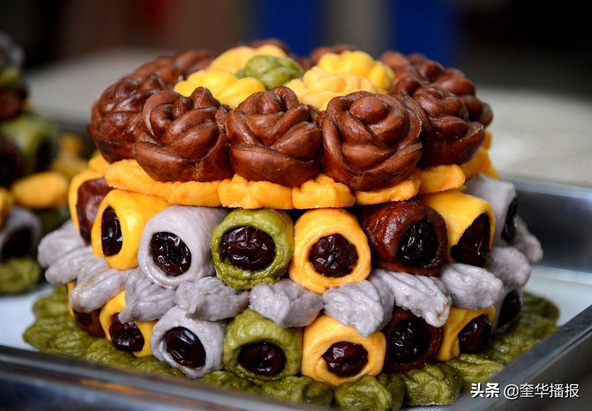 花糕又称枣糕、年糕、糕,在这里权称“花糕”吧。是中华传统食品的一种,年糕不同于粘糕,其粘糕是黏米面制作的,正常是制作粘枣窝窝。花糕是每到进了年腊月二十三,娘家母亲或者长辈给新女婿、近亲晚辈制作的节后回的“年礼”,其外形为宝塔形状,寓意为工作、事业、家庭步步高。其原料多为面粉、枣。更有巧妇将花糕制作成各种样式,有动物、花卉、四季果、蔬造型等。回赠新女婿的糕,每年逐渐增高,比如第一年三层、第二年4层、第三年5层,相应的每年的体积与重量也逐年递增,小的糕3斤左右,中等的6斤左右,大的15斤左右,今年看到了一个最大的花糕,重大128斤。在婚礼上也经常看到新娘子下轿(下车)先用足登糕的习俗又称新娘子过门,寓意日子越过越红火、幸福生活一天比一天高。还有老人过寿、添子添孙,近亲长辈与同辈也专门制作花糕,送老人、送同辈的子、孙等,其寓意略有不同,送老人祝老人高寿,送子、孙寓意越长越高等等。春节各家各户给家祖上供也离不开年糕,一般把糕放在供桌里面的正中位置,寓意为尊重祖先,祖先为“高”为“大”。