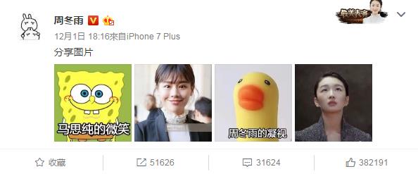周冬雨不仅拿去自黑,还发了个“周冬雨的凝视”和“马思纯的微笑”。