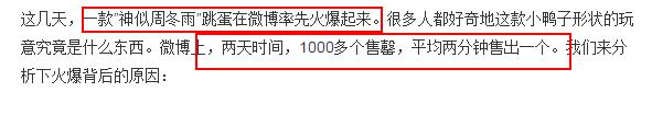 而后在2015年的年底,这个像极了周冬雨的小鸭子,还因为周冬雨红了起来!销售方大致的做过这个小鸭子的销量统计,“微博上的销售量,两天时间,1000多个售罄,平均两分钟售出一个。”