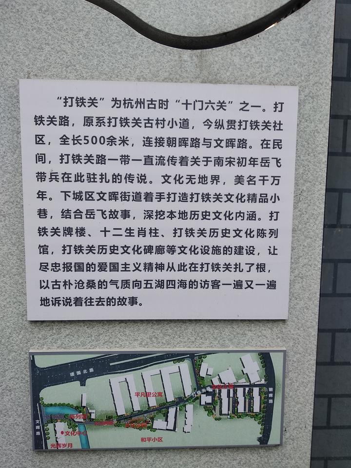 现在真正的打铁关遗址,几乎不可寻觅了。唯有留在打铁关路上的“打铁关历史文化纪念馆”和“打铁关历史文化碑廊”,或可拾到当年的历史碎片。这里的石碑等刻文均说,打铁关是宋代名将岳飞曾经率领岳家军扎营,并打造过兵器的地方。打铁关社区在前几年背街小巷的改造过程中,特意筹款建造了牌楼和碑廊、石刻浮雕,还有岳飞亭及历史文化纪念馆,打铁关路俨然被包装成社区里的“文化一条街”。