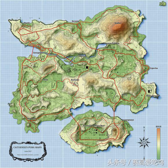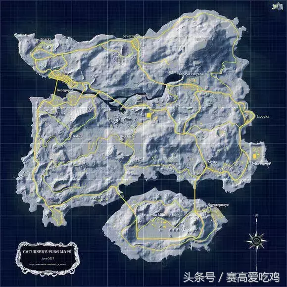 顺便高清的地图给你萌可以自己拿去做专属的物资地图哦~学过地理的一定知道这个就是等高线图了,这儿给出这张地图是想让大家了解一下老地图的山脉分布,海岛图有很多山坡,清楚哪里有山也是一件很重要的事,毕竟难免有lyb在制高点用15倍awm正瞄准着你……