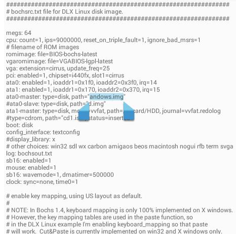5。手机安装系统必须获得root权限,然后使用下载的“re file manager”进入SDL文件,检查bochsrc.txt文件,点击菜单按钮选择“文本编辑”。将bochsrc.txt中下图所示的项更改为图像文件的名称