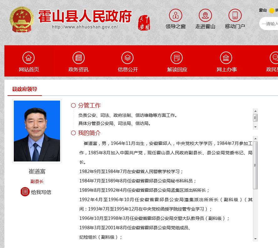 大皖时局综合 霍山县政府网“领导之窗”专栏近日更新,崔道富已出任霍山县副县长。其分管工作为,负责公安、司法、政府法制、信访维稳等方面工作。具体分管县公安局、司法局、信访局。