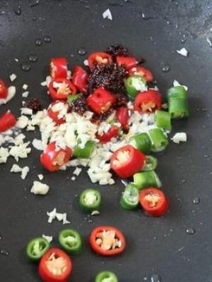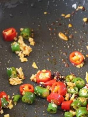 倒掉锅内鸡膝多余的油,留底油,鸡软骨的做法大全,下青红线椒圈和蒜末炒香,加一点点香辣酱炒匀,鸡软骨是哪个部位图片解析,鸡软骨是在鸡的哪个部位,鸡软骨掌中宝做法。