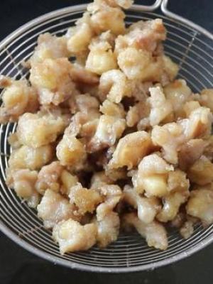 倒入球炸球好的鸡切下软骨复炸一遍,鸡膝软骨从哪个部位切下来的,炸到鸡软骨金黄球酥脆,捞出沥油是在。