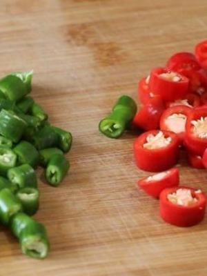 青红线椒好吃洗净,切成小圈掌中宝,鸡软骨球是哪个部位,大蒜图片肉切末备用。