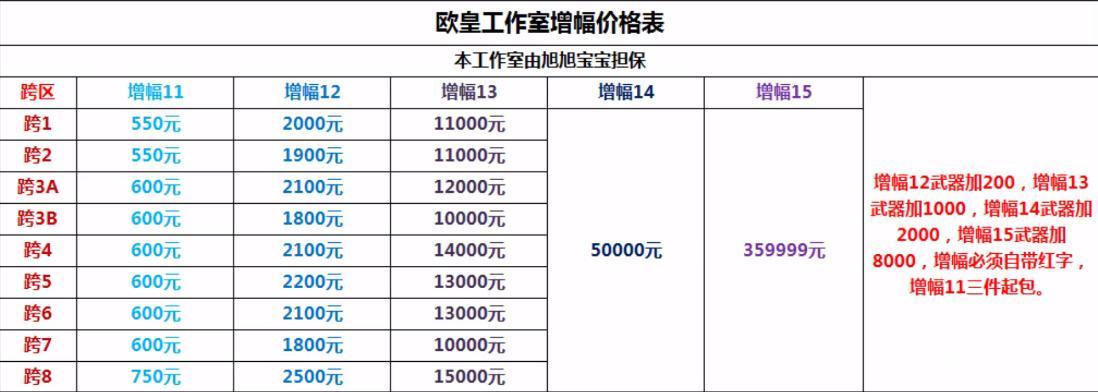 而增幅的价格则更加贵,不同的区价格会有差异,跨1跨2相对便宜一点,就跨8最贵,如果增幅14以上,价格则统一了,增幅14需要5万,而增幅15需要要36万,如果增幅的武器,还要外加8000元。看到这,只能感叹有钱真好。