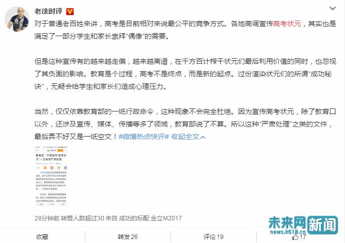 “因为宣传高考状元,除了教育口以外,还涉及宣传、媒体、传播等多了领域,教育部说了不算。所以这种‘严肃处理’之类的文件,最后弄不好又是一纸空文!”