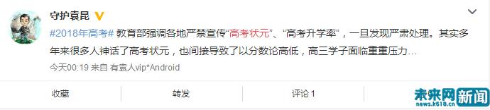 微博认证为“知名互联网资讯博主、头条文章作者、微博签约自媒体”的@守护袁昆和网友@猫猫控的卢叔叔也为高考莘莘学子减压而点赞。