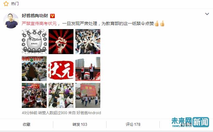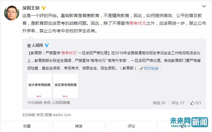 “教育部严禁宣传高考状元和升学率的举措,是让教育回归教育本质的关键举措,有利于扭转对分数过分看重而忽略其他方面发展的局面。”微博认证为“高等学校马克思主义理论类教师”的@王钰鑫认为,只有德智体美全面发展,才能成为新时代的新青年。