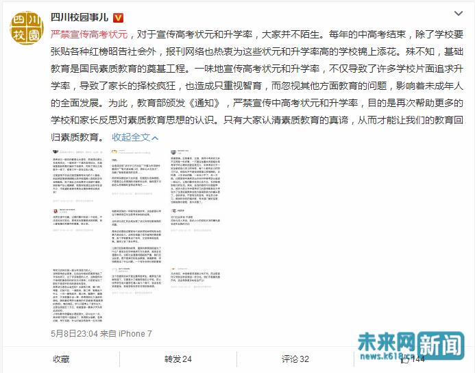 微博认证为“知名校园博主、知名本地博主、校园资讯博主(成都)资讯视频自媒体”的博主@四川校园那些事儿不仅道出了当下的现状,更说明了“禁止宣传高考状元”背后的更深层的意义。