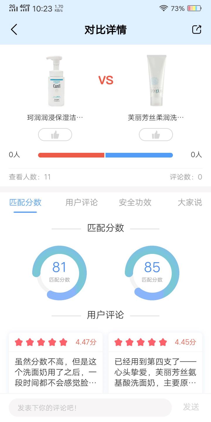 舒适度:看个人的肤质谁更适合谁,借助真我APP的“尖货对比”,芙丽芳丝与我肤质的匹配度跟高,更适合我