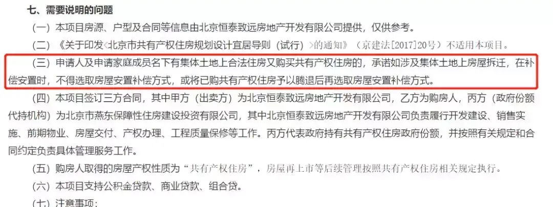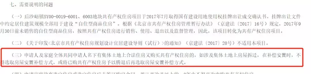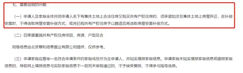 第一:在多数共有产权房的申请公告中,均对拆迁一事有所说明:申请人及申请家庭成员名下有集体土地上合法住房又购买共有产权住房的,承诺如涉及集体土地上房屋拆迁,在补偿安置时,不得选取房屋安置补偿方式,或将已购共有产权住房予以腾退后再选取房屋安置补偿方式。