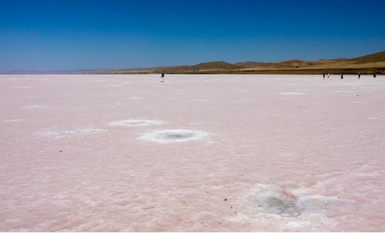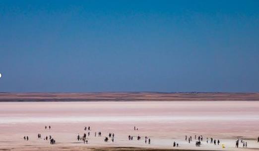 很大一片的粉色盐湖,但据说湖水颜色和湖水量会根据季节变化而变化。再往湖里走走就是蓝白色的天空之境了。