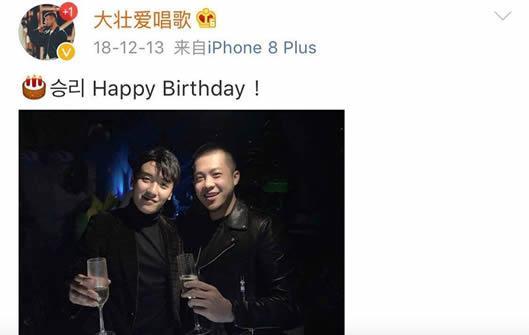 据他现在的动态,都还停留在去年,一个人火了后又凉了,连人气也跟着凉了。然而让人意外的却是大壮的一则微博。18年12月13日,大壮晒出了与胜利的合影,手拿着香槟酒,似乎在庆祝生日。