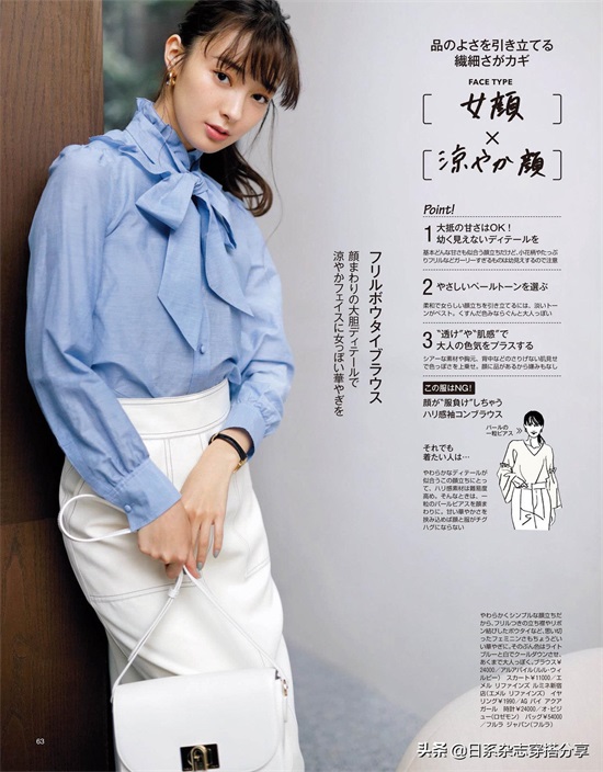 浅蓝色上衣,这个颜色比较常见,下半身主要搭配白色,棕色,同深色系,搭配起来非常和蔼可亲,层次感十足。